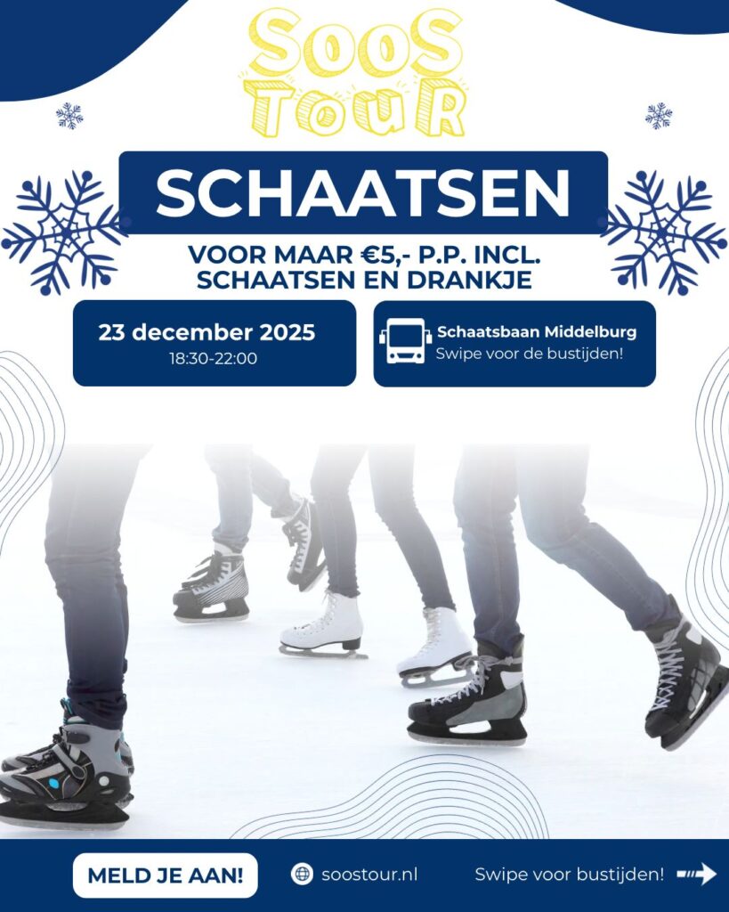 SooSTouR gaat schaatsen op de schaatsbaan op de Grote Markt in Middelburg. We gaan met de bus en gaan samen met je vrienden het ijs op voor een gezellige winteravond.