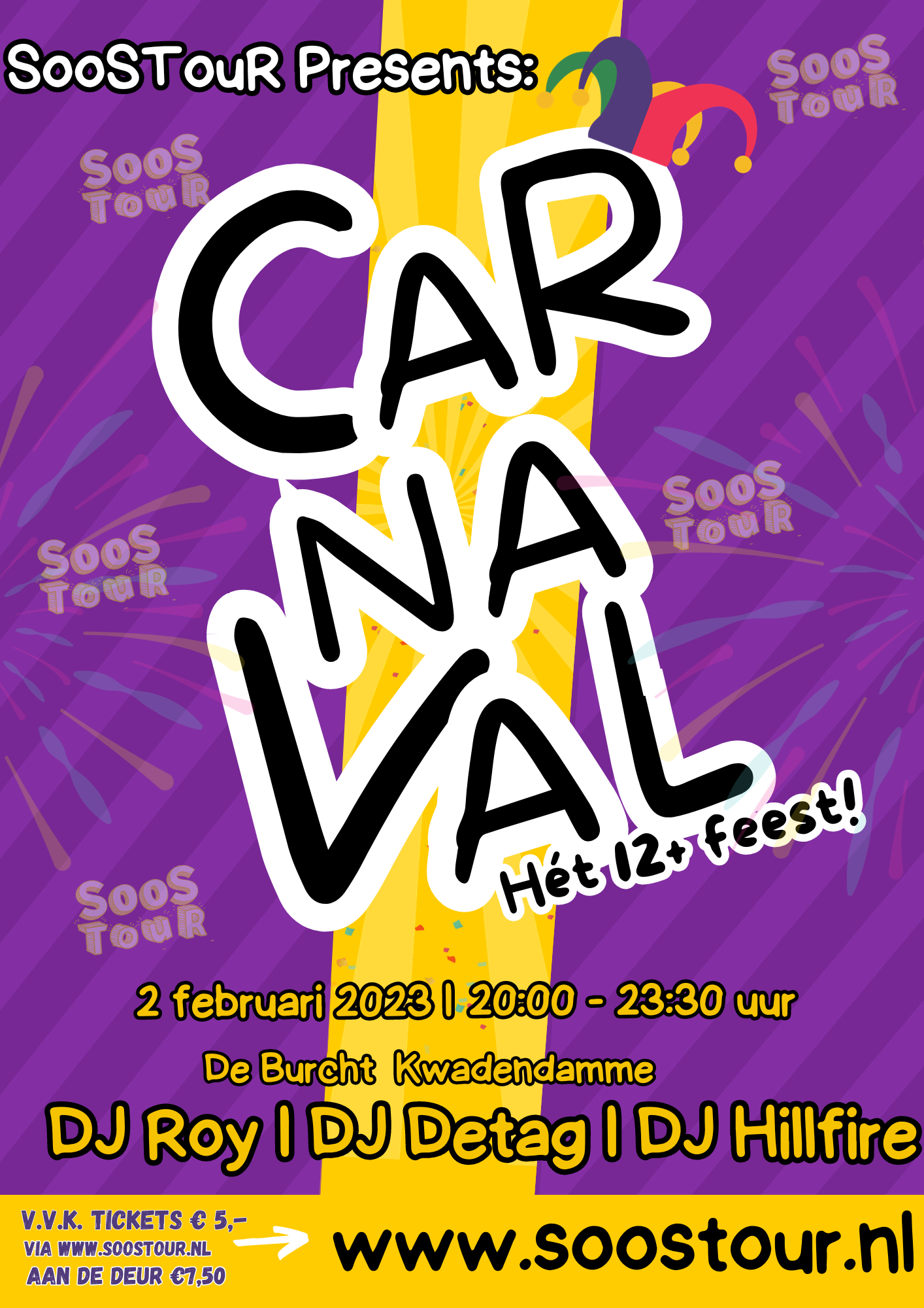 SooSTouR Carnaval 2026 Dit jaar strijkt SooSTouR neer in Lewedorp voor een nieuwe editie van SooSTouR Carnaval. Hét feest voor middelbare scholieren. Kom alvast helemaal in de carnavalsstemming! Vrijdag 6 februari Vanaf 20.00 uur Dorphuus De Zandploper (Lewedorp) TicketsBestel je kaarten via de knop hieronder en verzeker jezelf van een plekje op de dansvloer Voor wie?SooSTouR Carnaval is voor jongeren in de […]